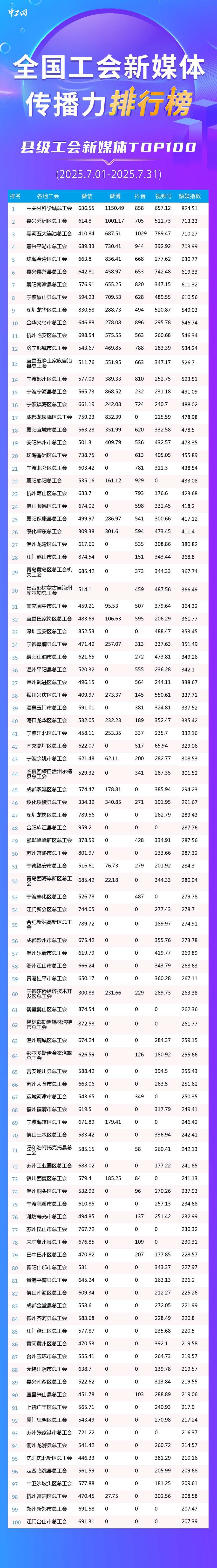 7月全國工會新媒體傳播力排行榜全國總榜TOP30