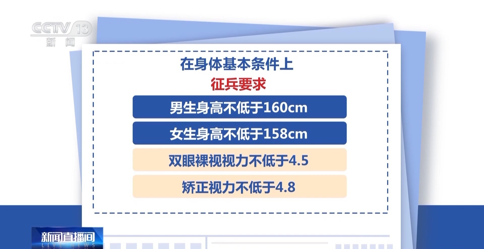 在身體基本條件上,征兵要求男生身高不低于160cm,女生不低于158cm,雙眼裸視視力不低于4.5,矯正視力不低于4.8,具體標準可查詢全國征兵網(http://www.gfbzb.gov.cn/)體格檢查標準摘要。有意向參軍入伍的大學生,需登錄“全國征兵網”,如實填寫相關信息報名應征。