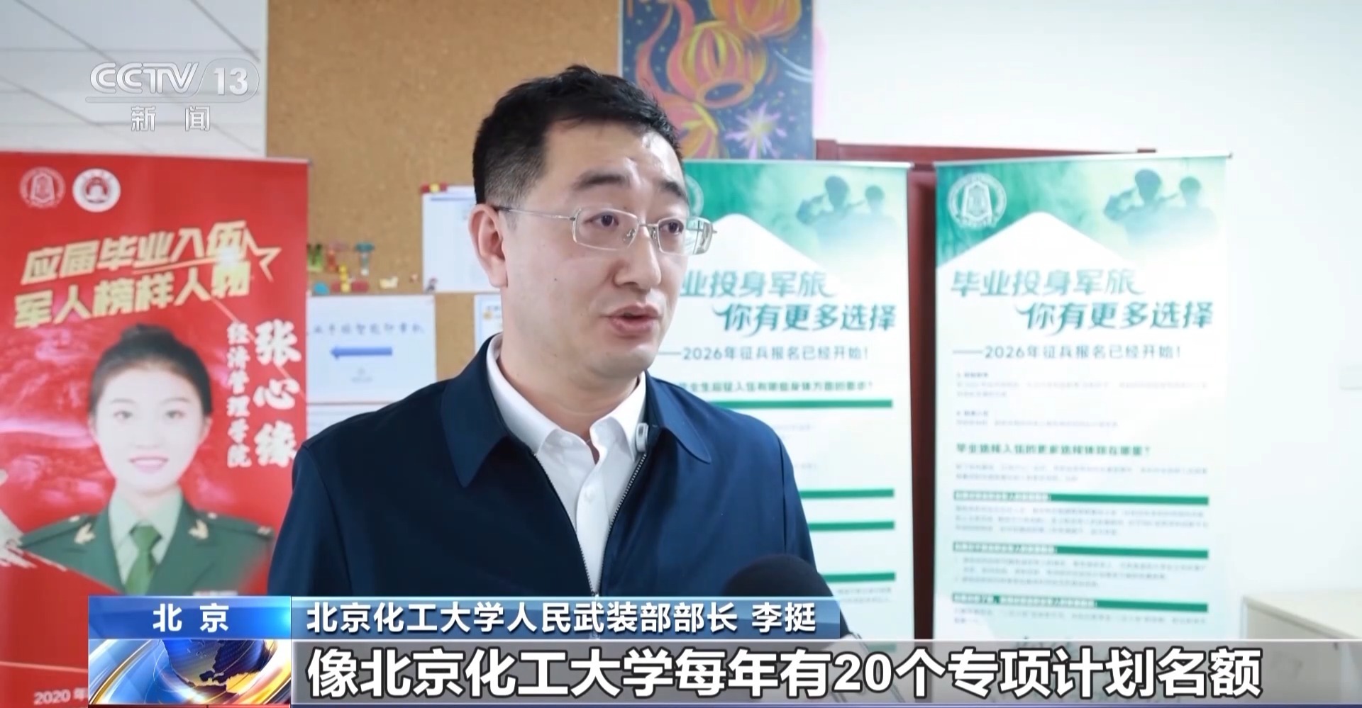 北京化工大學人民武裝部部長 李挺:退役學生想考研的話,像北京化工大學每年有20個專項計劃名額。對于應征入伍的在校學生來說,服役回來的學生,除了特定專業之外,可以回來在全校任選專業。對于畢業生來說,我們更建議征兵入伍是一個職業選擇,把自己的職業生涯規劃到部隊。