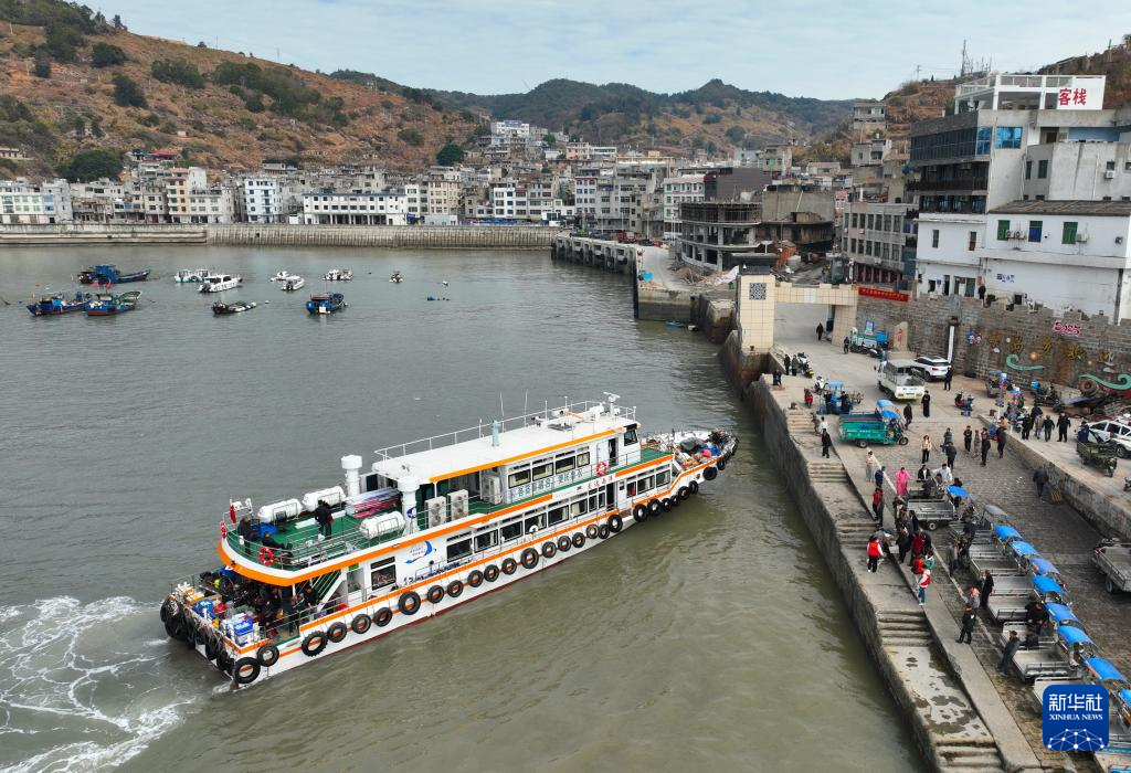 1月26日,客貨郵融合班船在霞浦縣海島鄉的西洋島碼頭靠泊(無人機照片)。新華社記者 林善傳 攝