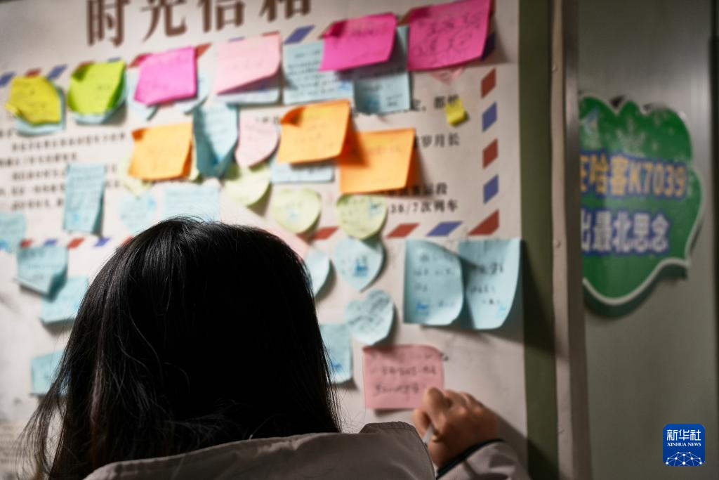 1月26日晚,在哈爾濱開往漠河的“雪國列車”上,游客在時光信箱上寫下愿望。新華社記者 王祚 攝