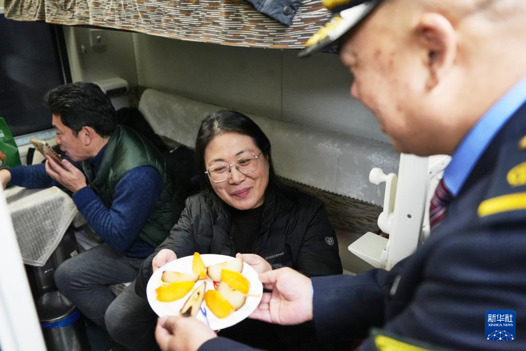 1月26日晚,在哈爾濱開往漠河的“雪國列車”上,乘務員為游客遞上特色果盤。新華社記者 王祚 攝
