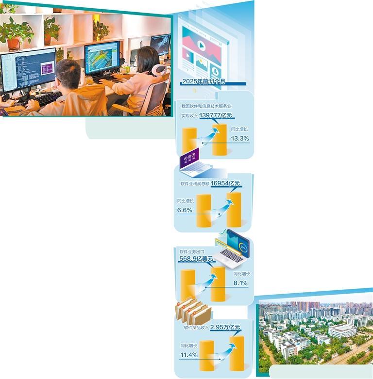 工業和信息化部數據顯示,2025年前11個月,我國軟件和信息技術服務業(以下簡稱“軟件業”)運行態勢良好,實現收入139777億元,同比增長13.3%;軟件業利潤總額16954億元,同比增長6.6%;軟件業務出口568.9億美元,同比增長8.1%,增速連續9個月保持正增長。