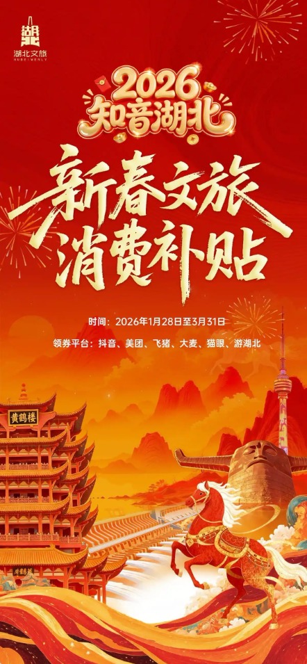 1月28日至3月31日,湖北省將面向所有在湖北及前來湖北的文旅消費者,發放總額高達6000萬元的“知音湖北”新春文旅消費補貼,真金白銀惠民促消費。湖北省文化和旅游廳、湖北省財政廳1月27日聯合宣布,發放新春文旅消費補貼,旨在為激活新春文旅市場,讓人民群眾樂享新春佳節。