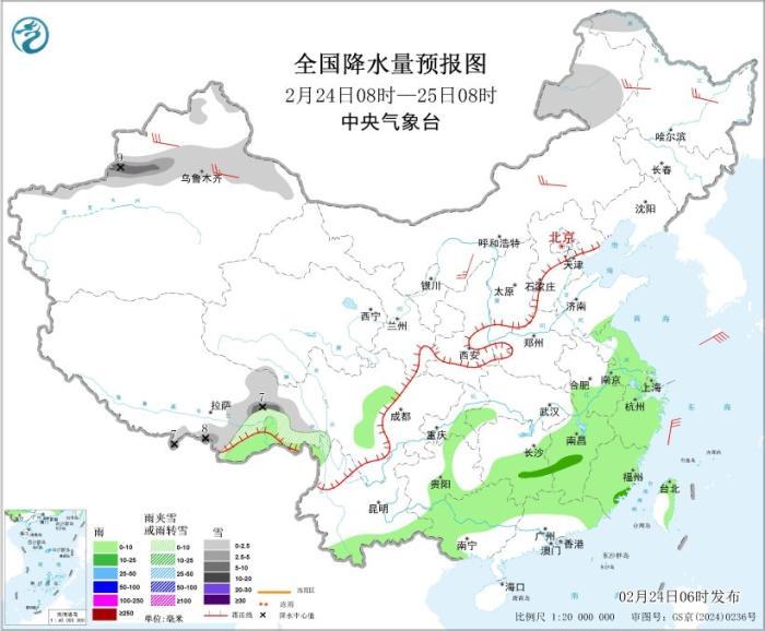 全國降水量預報圖(2月24日08時-25日08時) 。圖片來源:中央氣象臺網站