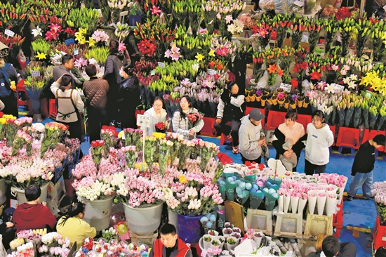 春節將至,云南省昆明市斗南花卉市場人頭攢動,人們選購年宵花、鮮切花等,各類花卉銷售持續走俏。
