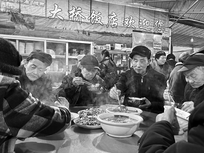 20年里,大橋飯店已成為一個(gè)樞紐,來自各方的資源在那里匯集,再“點(diǎn)對(duì)點(diǎn)”地輻射至每一位“搭伙”老人,老人們則因?yàn)轱埖暧辛烁芮械年P(guān)聯(lián)。縱橫交錯(cuò)間,一個(gè)農(nóng)村互助養(yǎng)老的空間由此形成。