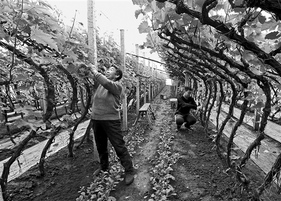 2月4日,海港經濟開發區王灘鎮的農民在管護大棚葡萄。