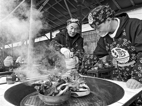 活動當天,十余支村級參賽隊伍進行廚藝大比拼,展示本土特色菜品,還進行了多項非遺巡演,開設了農特產品和文創產品展銷點。新華社記者 李凡 攝