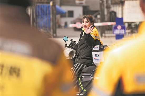 2月4日,戚德敏接到新的訂單后,向其他同事揮手道別。戚德敏是一名95后外賣女騎手,出生于安徽六安,16歲跟隨父親到山西太原生活。她進過工廠、做過買賣,于2024年成為一名外賣騎手。