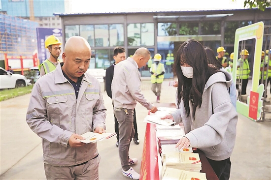 ③日前,海口市總工會主辦的“椰小工送法進工地”專題講座走進金城·金邦安居房項目工地,將法律知識送到農(nóng)民工身邊。海口市總工會 供圖