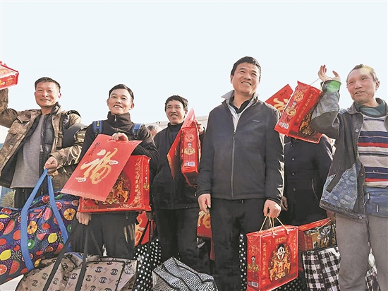 ①2月4日,由武漢市總工會主辦的送農(nóng)民工工友平安返鄉(xiāng)活動舉行,首批80名農(nóng)民工手里捧著沉甸甸的過年大禮包,踏上返鄉(xiāng)之路。本報記者 張翀 攝