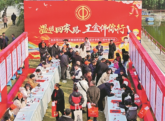 ④2月6日,四川省自貢市總工會、市人社局和市農(nóng)民工服務(wù)中心聯(lián)合舉辦“溫暖回家路 工會伴你行”關(guān)愛服務(wù)農(nóng)民工暨返鄉(xiāng)農(nóng)民工團年飯活動。活動現(xiàn)場開設(shè)了院壩招聘會。自貢市總工會 供圖