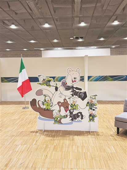 繪有米蘭冬奧會吉祥物的展板。本報特派記者劉兵 攝
