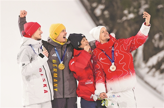 米蘭-科爾蒂納冬奧會跳臺滑雪項目男子個人標準臺冠軍德國選手菲利普·雷蒙德(左二)和亞、季軍選手在頒獎儀式上自拍。新華社記者 孟永民 攝