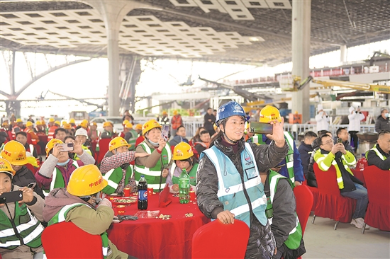 2月12日下午,在陜西重大基礎設施項目——西安東站建設現場,陜西省建設工會為300余名春節期間堅守崗位的一線建設者,舉辦迎新春慰問活動,為他們表演了合唱、相聲、雜技、魔術等文藝節目。圖為建設者開心地拍攝演出節目。本報記者 祝盼 攝