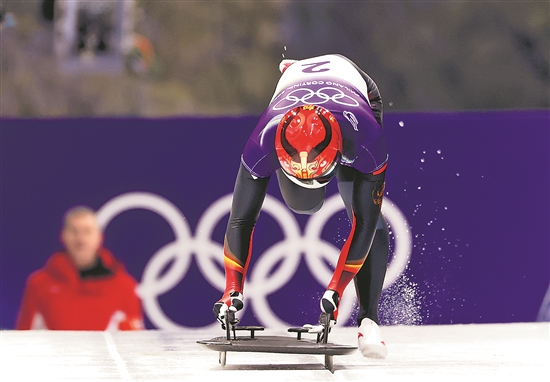 當?shù)貢r間2月12日,米蘭-科爾蒂納冬奧會鋼架雪車項目男子單人賽在意大利科爾蒂納舉行。圖為中國選手殷正在第一輪比賽中,他在兩輪比賽后暫時并列第八名。新華社記者 丁旭 攝