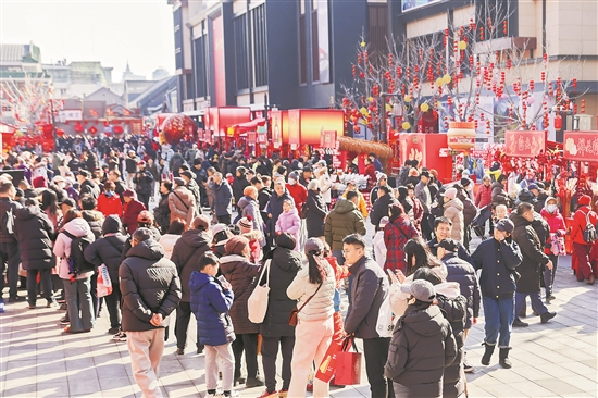 隨著春節(jié)臨近,在北京隆福寺街區(qū),以“馬不停蹄,隆福潮集”為主題的2026隆福寺新春市集吸引越來(lái)越多的游客前來(lái)游覽和購(gòu)物。
